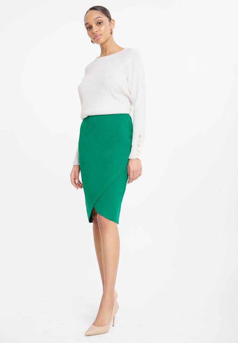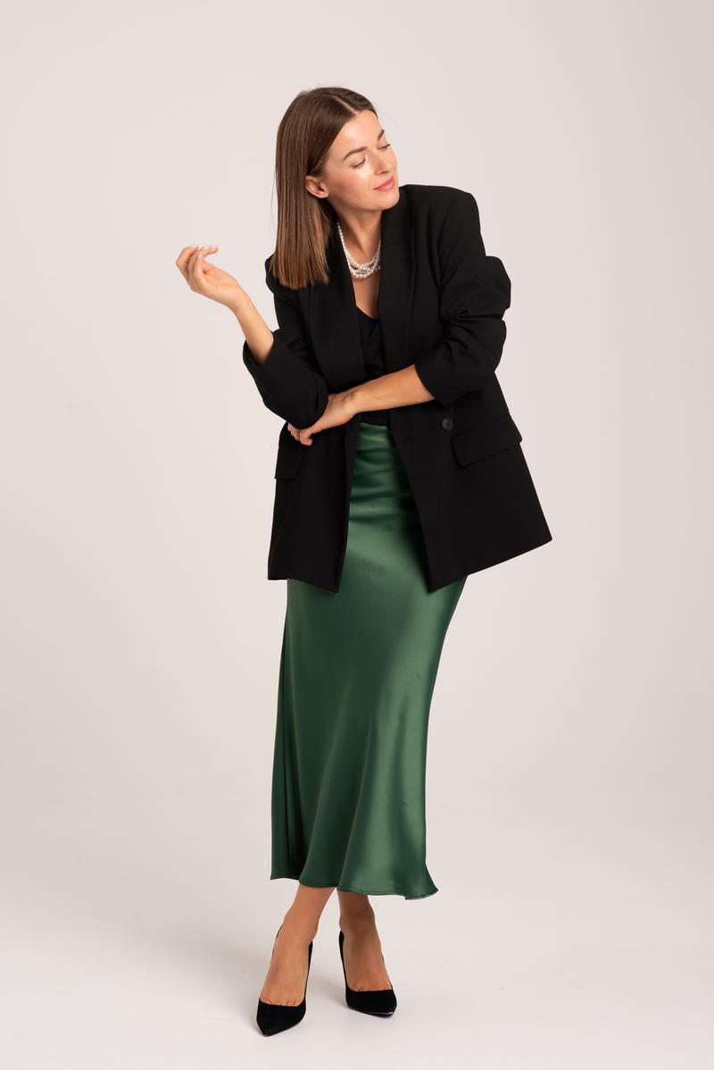 - Butelkowa zieleń z ołówkową spódnicą i szpilkami na wieczorne wyjście.